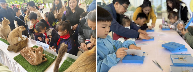 在标本展示区,朱鹮、林麝、红腹锦鸡、金丝猴等秦岭珍稀野生动物标本整齐陈立,科研人员结合标本详细介绍物种特征、生活习性及保护现状;互动体验区,蝴蝶标本制作深受小朋友喜爱,家长带着孩子一起动手,在动手制作中学习动物知识。